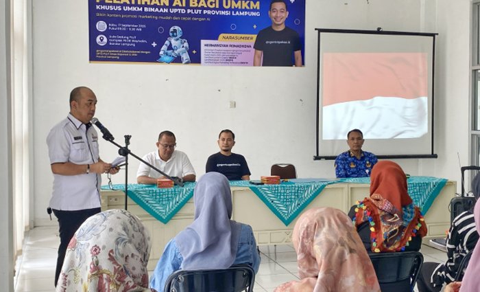 BANDAR LAMPUNG, BERITAANDA – UPTD Pusat Layanan Usaha Terpadu (PLUT) Provinsi Lampung menyelenggarakan pelatihan Artificial Intelligence (AI) bagi para UMKM binaan, bekerja sama dengan @ngontenpakeai.id. Kegiatan berlangsung di Ruang Pelatihan UPTD PLUT Provinsi Lampung, Rabu (17/9/2025).