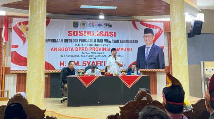 BANDAR LAMPUNG, BERITAANDA – Anggota DPRD Provinsi Lampung AM. Syafi’i menggelar kegiatan Sosialisasi pembinaan ideologi Pancasila dan wawasan kebangsaan di Kabupaten Tanggamus. Acara ini berlangsung di Aula Pertemuan Hotel 21, Kecamatan Gisting, Senin (10/2/2025).