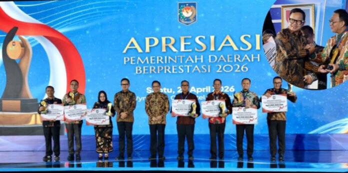 Bupati Tapanuli Selatan H. Gus Irawan Pasaribu didampingi Sekretaris Daerah H. Sofyan Adil Siregar saat menerima Piagam Penghargaan Juara II Kategori Penanggulangan Kemiskinan dan Percepatan Penurunan Stunting pada ajang Apresiasi Pemerintah Daerah Berprestasi 2026