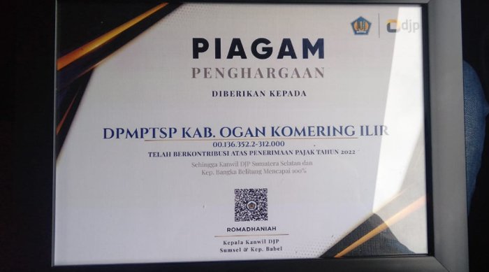 OKI, BERITAANDA – Karena telah berkontribusi atas penerimaan pajak tahun 2022, Bupati Kabupaten Ogan Komering Ilir (OKI) H. Iskandar SE melalui Dinas Penanaman Modal dan Pelayanan Terpadu Satu Pintu (DPMPTSP) OKI mendapat penghargaan dari Kanwil Direktorat Jenderal Pajak (DJP) Sumatera Setatan dan Kepulauan Bangka Belitung (Sumsel Babel).