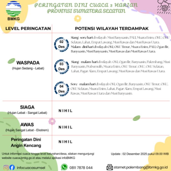 PALEMBANG, BERITAANDA – Badan Meteorologi, Klimatologi dan Geofisika (BMKG) Sumatera Selatan (Sumsel) mengeluarkan peringatan dini terkait potensi hujan yang diprediksi melanda sejumlah kabupaten/kota di Sumsel selama tiga hari berturut-turut pada Selasa hingga Kamis (2–4/12/2025).