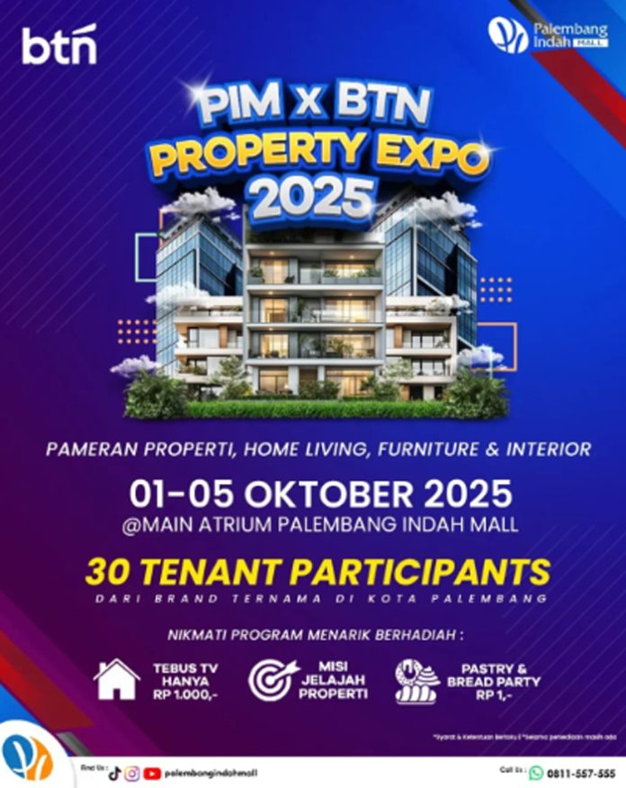 PALEMBANG, BERITAANDA – Bagi masyarakat yang ingin membeli properti, bisa memanfaatkan kegiatan Property Expo PIM yang berkolaborasi dengan BTN. Acara ini akan dilaksanakan di Palembang Indah Mall (PIM) pada 1–5 Oktober 2025 mendatang.