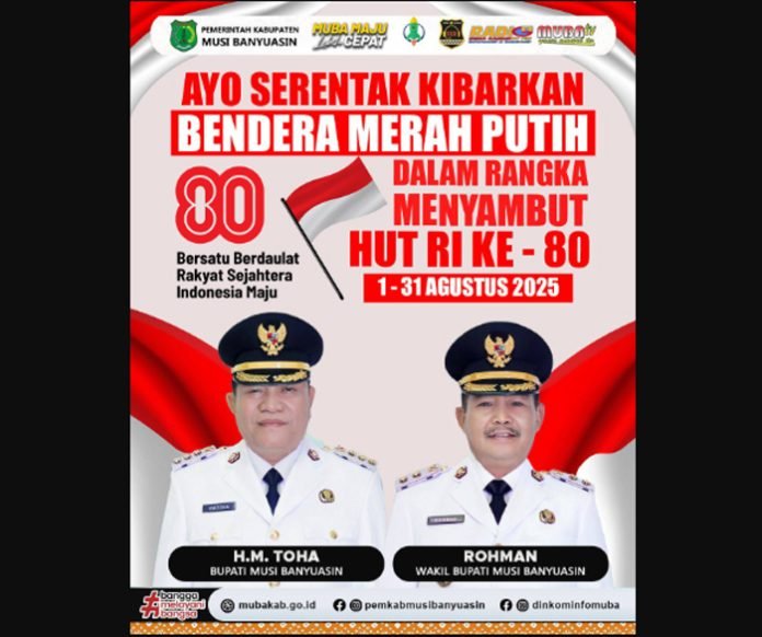 MUSI BANYUASIN, BERITAANDA – Menyambut Hari Ulang Tahun (HUT) ke-80 Kemerdekaan Republik Indonesia, Bupati Musi Banyuasin (Muba) HM. Toha mengajak seluruh masyarakat untuk mengibarkan bendera merah putih dan memasang umbul-umbul di rumah masing-masing sepanjang bulan Agustus 2025.