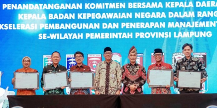LAMPUNG SELATAN, BERITAANDA – Bupati Lampung Selatan Radityo Egi Pratama menandatangani komitmen bersama kepala daerah dengan Badan Kepegawaian Negara (BKN) dalam upaya mempercepat pembangunan serta penerapan manajemen talenta Aparatur Sipil Negara (ASN) di wilayah Provinsi Lampung.
