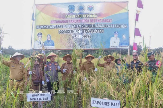 PALI, BERITAANDA – Bupati PALI Dr. Ir. H. Heri Amalindo MM turut serta dalam acara panen perdana untuk mendukung ketahanan pangan di Desa Betung Barat Kecamatan Abab, Senin (25/3/2024).