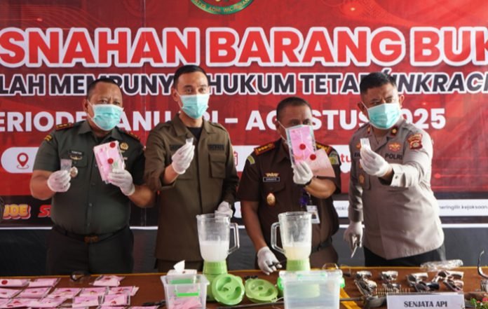OGAN KOMERING ILIR, BERITAANDA — Komandan Kodim (Dandim) 0402/OKI Letkol Inf Yontri Bhakti SH MH menghadiri kegiatan pemusnahan barang bukti tindak pidana umum yang telah berkekuatan hukum tetap (inkracht). Acara berlangsung di halaman Kantor Kejaksaan Negeri Ogan Komering Ilir (Kejari OKI), Rabu (27/8/2025).