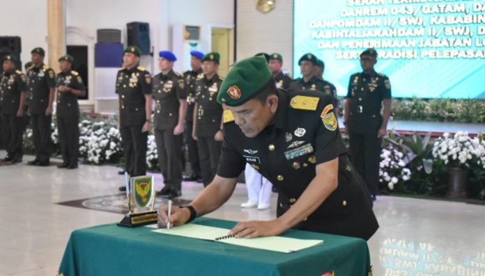 BANDAR LAMPUNG, BERITAANDA – Pangdam II/Sriwijaya Mayjen TNI M. Naudi Nurdika SIP M.Si M.Tr (Han) memimpin langsung upacara serah terima jabatan (sertijab) Danrem 043/Gatam dari pejabat lama Brigjen TNI Iwan Ma’ruf Zainudin SE kepada pejabat baru Brigjen TNI Rikas Hidayatullah SE MM, Selasa (7/5/2024), di Gedung Sudirman Makodam II/Sriwijaya Jl. Jenderal Sudirman KM 2,5 Kecamatan Ilir Timur 1 Kota Palembang Sumatera Selatan.