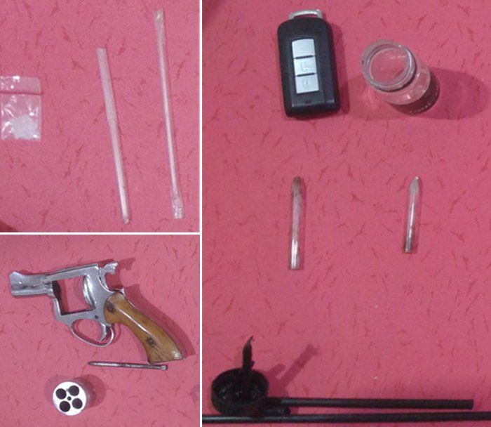 Barang bukti yang diamankan dari lokasi antara lain 1 plastik klip bening berisi kristal putih diduga sabu seberat ±0,40 gram, 2 batang pipet kaca (pirek) berisi endapan putih diduga sabu, 2 pipet plastik dengan bercak kristal, 1 set alat isap sabu (bong), serta 1 pucuk senjata api rakitan jenis revolver silinder putar, ditemukan di celana tersangka MRI.