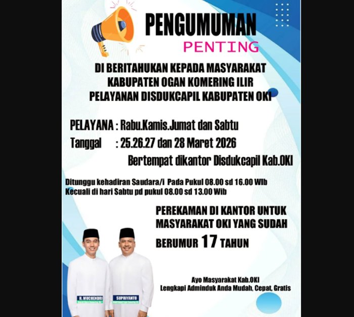Pelayanan tersebut akan dilaksanakan selama empat hari, pada tanggal 25, 26, 27, dan 28 Maret 2026. Kegiatan ini bertempat di Kantor Disdukcapil Kabupaten OKI.