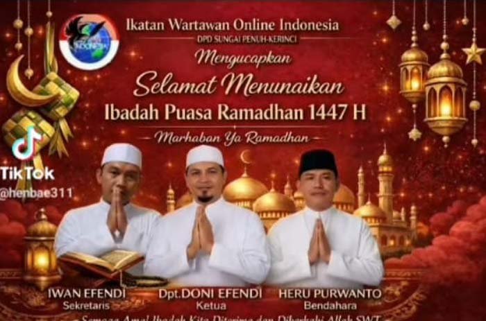 SUNGAI PENUH, BERITAANDA – Dalam rangka menyambut datangnya bulan suci Ramadan 1447 Hijriah, Dewan Pimpinan Daerah Ikatan Wartawan Online Indonesia (DPD IWOI) Sungai Penuh–Kerinci menyampaikan ucapan selamat menjalankan ibadah puasa kepada seluruh umat Muslim, khususnya masyarakat Kota Sungai Penuh dan Kabupaten Kerinci.