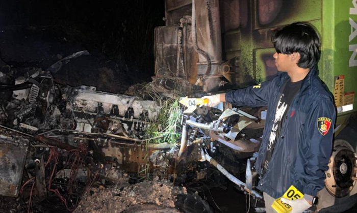 Benturan keras menyebabkan bagian depan kedua kendaraan terbakar. Kobaran api dengan cepat membesar, mengakibatkan salah satu pengemudi tidak sempat keluar dari kabin.