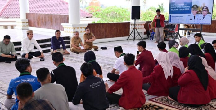 LAMPUNG SELATAN, BERITAANDA – Radityo Egi Pratama memilih duduk lesehan bersama mahasiswa saat menerima perwakilan Aliansi Cipayung Plus dan Badan Eksekutif Mahasiswa (BEM) se-Lampung Selatan di Pendopo Agung, Rumah Dinas Bupati Lampung Selatan, Selasa (3/3/2026).