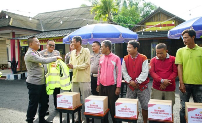 Kapolres OKI AKBP Eko Rubiyanto memimpin langsung kegiatan penyaluran bantuan berupa paket sembako dan rompi kamtibmas kepada pengemudi ojek pangkalan, petugas kebersihan, dan penarik becak. Kegiatan tersebut dilaksanakan di kawasan ‘Kedai Polres OKI Hadir’ di Kayuagung, Rabu (15/4/2026).