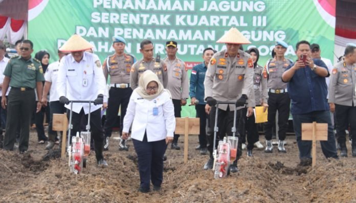 OGAN ILIR, BERITAANDA – Wakapolda Sumatera Selatan Brigjen Pol M. Zulkarnain SIK MS.i mewakili Kapolda Sumsel Irjen Pol Andi Rian R. Djajadi SIK MH, menghadiri kegiatan penanaman jagung serentak kuartal III di Desa Muara Baru, Kecamatan Pemulutan, Kabupaten Ogan Ilir (OI), Rabu (9/7/2025) sore.