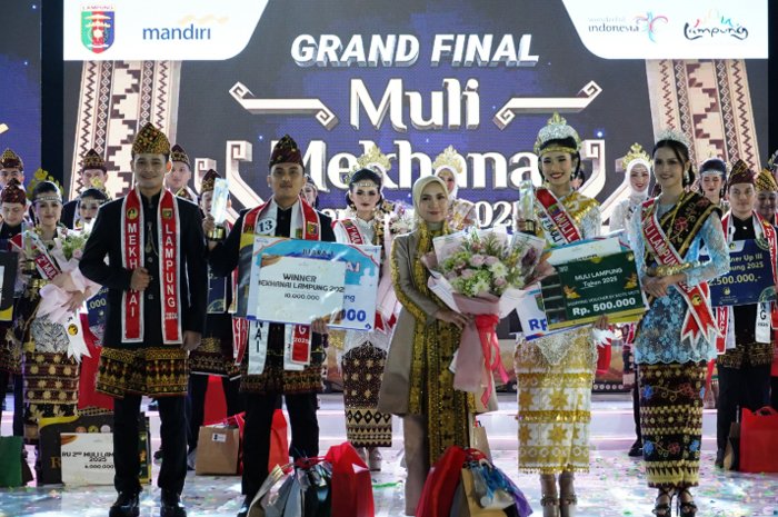 Sebagai penutup malam grand final, terpilih sebagai Muli Mekhanai Lampung 2025 adalah Marcheline Aurely dari Kota Bandar Lampung dan Muhammad Adit Bintang Hartahta dari Kabupaten Tulang Bawang. (Katharina)