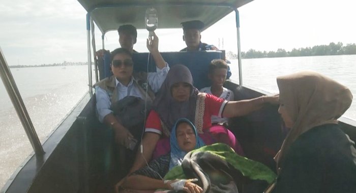 Rupiana dilarikan ke Rumah Sakit Pelabuhan Boom Baru Palembang menggunakan ambulans apung milik Ditpolairud Polda Sumsel.