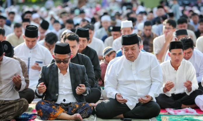 BANDAR LAMPUNG, BERITAANDA – Gubernur Lampung Arinal Djunaidi bersama keluarga dan Forkopimda melaksanakan sholat Idul Fitri (Ied) 1445 Hijriah di Lapangan Korem 043 Garuda Hitam, Saburai Enggal Bandar Lampung, Rabu (10/4/2024).