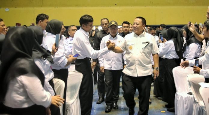 BANDAR LAMPUNG, BERITAANDA – Gubernur Lampung Arinal Djunaidi menyerahkan SK Pegawai Pemerintah dengan Perjanjian Kerja (PPPK) Jabatan Fungsional Kesehatan dan Fungsional Guru, serta melakukan pelantikan dan pengangkatan sumpah/janji ASN ke dalam jabatan fungsional dilingkungan Pemerintah Provinsi Lampung, berlangsung di GSG PKOR Way Halim Bandar Lampung, Rabu (8/5/2024).