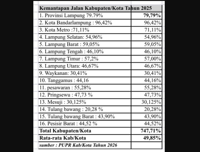 BANDAR LAMPUNG, BERITAANDA – Lampung hari ini berdiri di persimpangan yang ganjil. Disatu sisi, jalan provinsi relatif mulus dan menunjukkan kemajuan. Namun disisi lain, fondasi infrastruktur di tingkat kabupaten/kota justru retak di banyak tempat. Data kemantapan jalan tahun 2025 menegaskan satu hal, ketimpangan infrastruktur tidak hanya ada, tetapi telah melebar menjadi jurang.