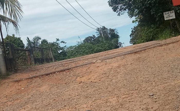 “Nak hati-hati lewat di sini, karena pas di tanjakan ini beberapa meter dari pipa tidak dicor ataupun diaspal. Ditambah lagi ada pipa yang terlihat di atas permukaan tanah. Jadi kalau motor bisa terpeleset atau kecelakaan, apalagi saat musim hujan kondisi licin. Kalau mobil bisa nyangkut juga,” ujarnya, Senin (1/9/2025).