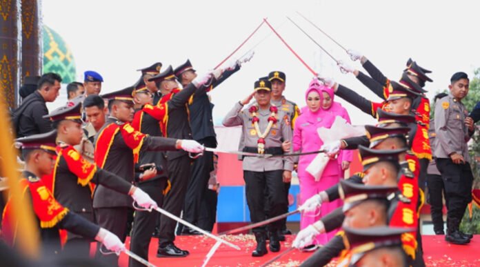 Momen pelepasan berlangsung khidmat dan penuh rasa kekeluargaan. Tradisi pedang pora mengiringi langkah Irjen Pol Andi Rian R. Djajadi beserta istri saat berpamitan dengan seluruh jajaran Polda Sumsel sebagai bentuk penghormatan atas pengabdian dan dedikasi selama bertugas.