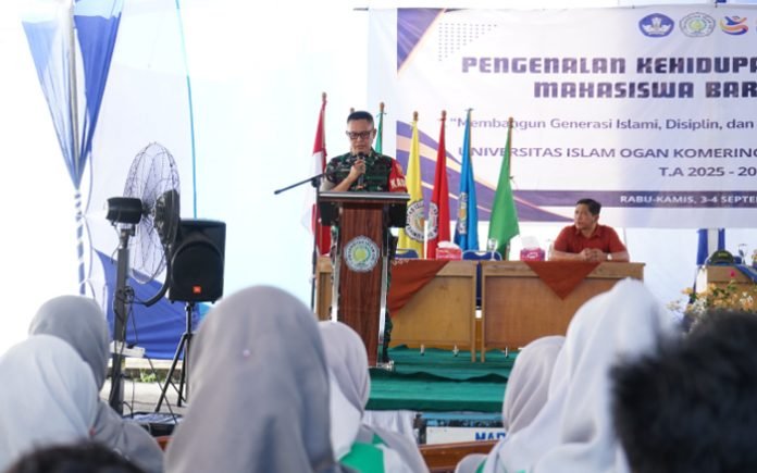 OGAN KOMERING ILIR, BERITAANDA – Kepala Staf Kodim 0402/Ogan Komering Ilir (OKI) Mayor CKE Jauhari menjadi pemateri dalam kegiatan Pengenalan Kehidupan Kampus bagi Mahasiswa Baru (PKKMB) Universitas Islam Ogan Komering Ilir (Uniski), Kamis (4/9/2025).