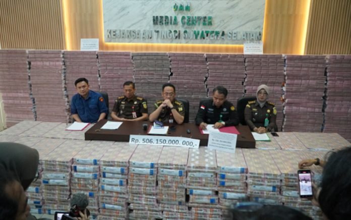 PALEMBANG, BERITAANDA – Tim Penyidik Tindak Pidana Khusus Kejaksaan Tinggi (Kejati) Sumatera Selatan (Sumsel) menyita barang bukti berupa uang tunai sebesar Rp506.150.000.000 dalam pecahan Rp100 ribu, Kamis (7/8/2025).
