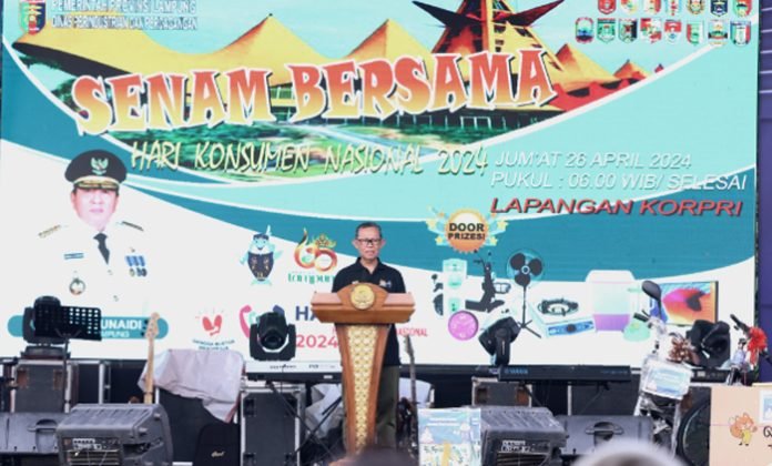 BANDAR LAMPUNG, BERITAANDA – Gubernur Lampung Arinal Djunaidi diwakili oleh Sekretaris Daerah Fahrizal Darminto mengikuti kegiatan senam bersama, dalam rangka peringatan Hari Konsumen Nasional tahun 2024, di lapangan Korpri Kantor Gubernur Lampung, Jumat (26/4/2024).