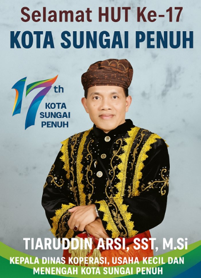 SUNGAI PENUH, BERITAANDA – Kepala Dinas Koperasi, Usaha Kecil dan Menengah (UKM) Kota Sungai Penuh, Tiaruddin Arsi SST M.Si, menyampaikan ucapan selamat memperingati Hari Ulang Tahun (HUT) ke-17 Kota Sungai Penuh.