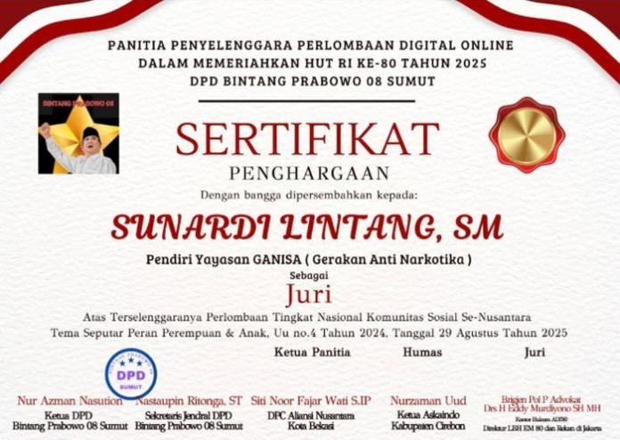 BEKASI, BERITAANDA – Pendiri Yayasan Ganisa (Gerakan Anti Narkotika), Sunardi Lintang SM, menerima penghargaan atas perannya sebagai juri dalam ajang perlombaan digital online tingkat nasional komunitas sosial se-nusantara yang digelar oleh DPD Bintang Prabowo 08 Sumatera Utara.