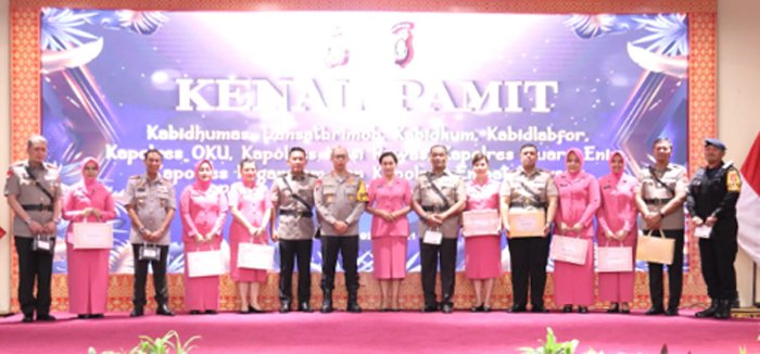 PALEMBANG, BERITAANDA – Atmosfer haru dan kebahagiaan turut memeriahkan acara kenal pamit empat pejabat utama lama (Kabid Humas, Dansat Brimob, Kabidkum dan Kabid Labfor) dengan yang baru, serta lima Kapolres (OKU, Musirawas, Muara Enim, Pagar Alam dan Empat Lawang) jajaran Polda Sumsel, Selasa (2/1/2024).