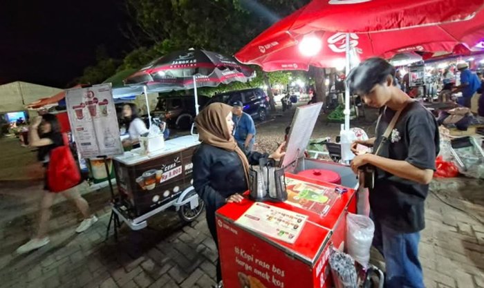 Dengan harga Rp8.000–12.000 per cangkir, pedagang kopi keliling menjadi pilihan banyak pengunjung yang membutuhkan kopi cepat dan terjangkau.