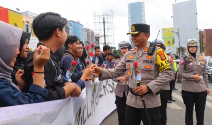 BANDAR LAMPUNG, BERITAANDA – Kapolresta Bandar Lampung Kombes Pol. Abdul Waras SIK bersama sejumlah polisi wanita (polwan) membagikan bunga kepada para peserta aksi unjuk rasa yang digelar di Tugu Adipura Kota Bandar Lampung, Rabu (1/5/2024).