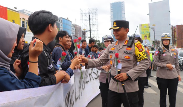 “Selain memberikan pengamanan, kita membagikan bunga kepada kawan-kawan peserta massa aksi sebagai simbol kedamaian, dan Alhamdulillah berjalan dengan aman dan tertib,” ungkap Kapolresta.