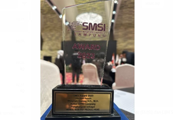 BANDAR LAMPUNG, BERITAANDA – Ketua DPRD Lampung Mingrum Gumay SH MH meraih penghargaan dari Serikat Media Siber Indonesia (SMSI) Provinsi Lampung, dalam rangka pelantikan pengurus baru periode 2022-2027 di Ballroom Hotel Novotel, Ahad (15/1/2022).