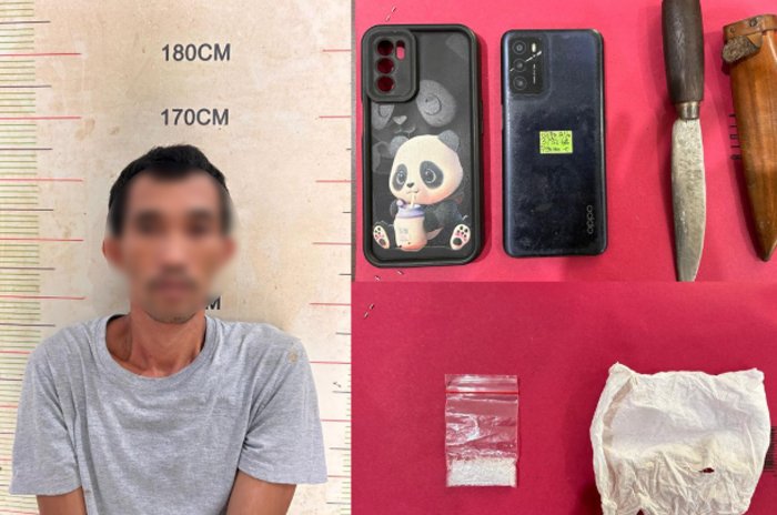 Dari hasil pemeriksaan, petugas mengamankan barang bukti berupa satu paket sabu dengan berat bruto 2,64 gram yang dibungkus tisu, satu bilah senjata tajam jenis wali, satu unit mobil Toyota Calya warna putih berplat Jakarta, serta satu unit telepon genggam merek Oppo A16 warna biru.