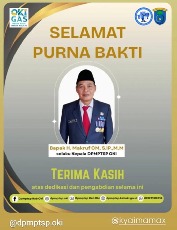 “Hari Jumat, hari yang baik, Insya Allah penuh berkah. Terima kasih atas dukungan dan kebersamaan selama ini. Saya ikhlas dan bangga pernah memimpin DPMPTSP OKI,” ujar H. Makruf, Senin (1/9/2025).