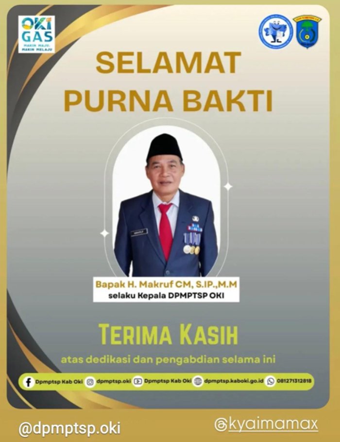 Kepala DPMPTSP OKI H. Makruf CM SIP MM resmi memasuki masa purna bakti setelah mengabdi selama bertahun-tahun.