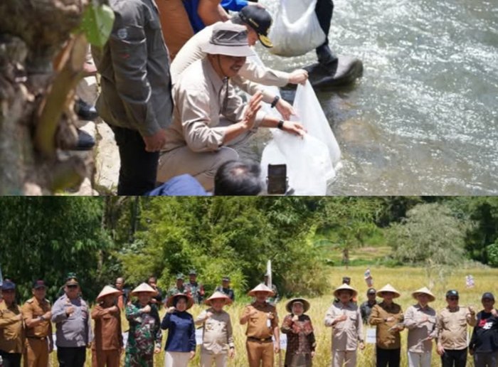 KERINCI, BERITAANDA – Bupati Kerinci Monadi S.Sos M.Si dan Wakil Bupati H. Murison S.Pd, S.Sos M.Si mendampingi Gubernur Jambi Dr. H. Al Haris S.Sos MH dalam kegiatan panen raya padi dan panen ikan semah di Lubuk Larangan, Desa Pungut Hilir, Kecamatan Air Hangat Timur, Kabupaten Kerinci, Rabu (7/5/2025).
