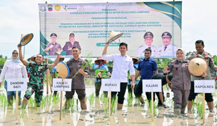 Kerja sama itu diwujudkan melalui penanaman padi biosalin di Desa Bandar Agung, Kecamatan Sragi, sekaligus peresmian Koperasi Konsumen Adhyaksa Mandiri Sejahtera Lampung, penyerahan sertifikat halal dan PIRT, bantuan CSR bagi UMKM, serta penandatanganan sejumlah akta kerja sama kelembagaan.