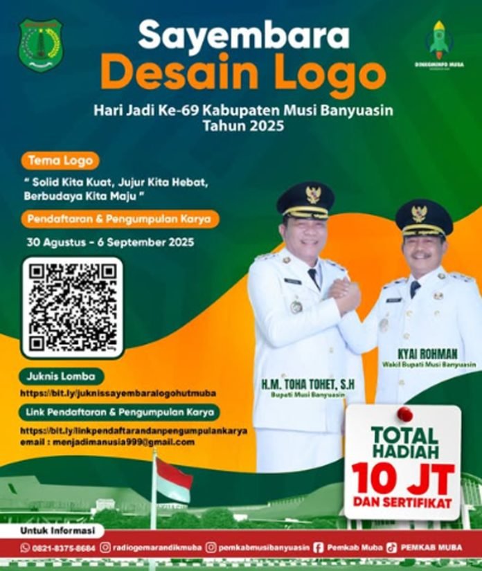 MUSI BANYUASIN, BERITAANDA – Pemerintah Kabupaten Musi Banyuasin (Pemkab Muba) mengajak masyarakat berpartisipasi dalam sayembara desain logo Hari Ulang Tahun (HUT) Muba ke-69 tahun 2025. Lomba yang berlangsung mulai 30 Agustus hingga 6 September ini menyediakan hadiah total Rp10 juta bagi para pemenang.
