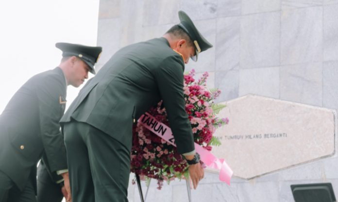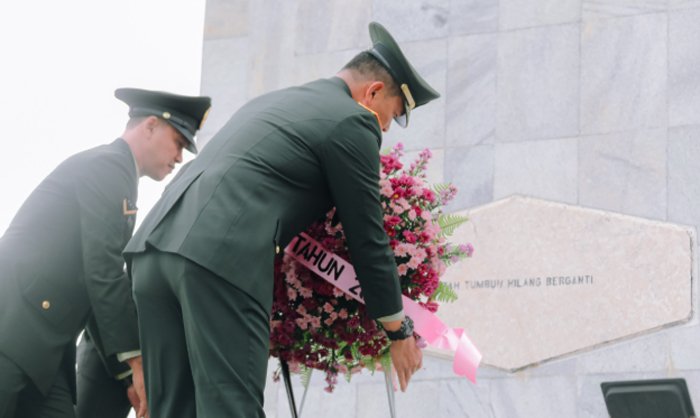 Suasana khidmat semakin terasa saat inspektur upacara meletakkan karangan bunga di tugu makam pahlawan sebagai bentuk penghormatan dan ungkapan terima kasih atas pengorbanan para pahlawan.