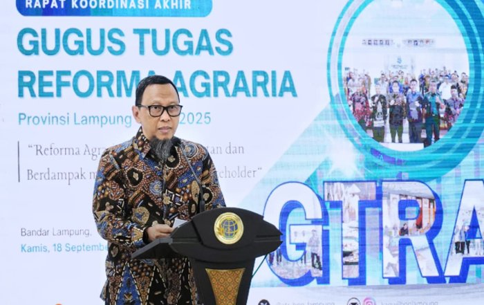 BANDAR LAMPUNG, BERITAANDA – Pemerintah Provinsi (Pemprov) Lampung mendorong pelaksanaan reforma agraria menjadi salah satu pilar penguatan ekonomi berbasis desa. Hal ini ditegaskan Gubernur Lampung Rahmat Mirzani Djausal yang diwakili Sekretaris Daerah Provinsi Lampung, Marindo Kurniawan, saat membuka rapat koordinasi akhir penyelenggaraan Gugus Tugas Reforma Agraria (GTRA) tahun 2025 di Aula Kantor BPN Provinsi Lampung, Kamis (18/9/2025).