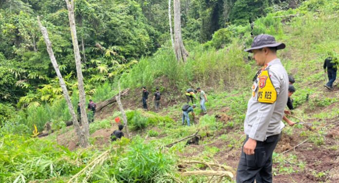 Menurutnya, tim yang dipimpin langsung oleh Kapolres bersama personel turun ke lokasi dan berhasil menemukan hamparan ladang ganja seluas kurang lebih 3 hektar.