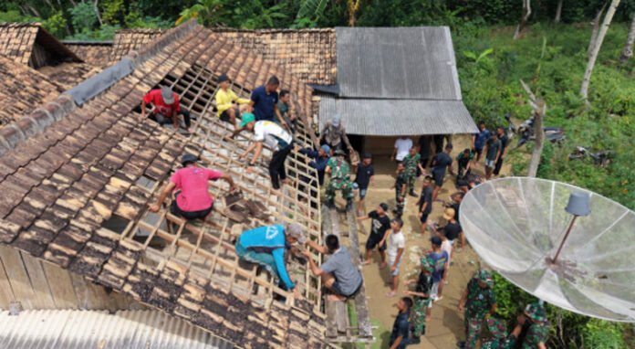 Proses pembongkaran dilakukan secara gotong royong bersama masyarakat setempat. Dengan semangat kebersamaan, prajurit TNI dan warga bahu-membahu merobohkan bagian rumah yang sudah rapuh untuk kemudian dibangun kembali menjadi hunian yang lebih kokoh, sehat, dan layak ditempati.
