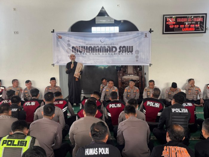 Kapolres OKI AKBP Eko Rubiyanto dalam sambutannya menegaskan bahwa peringatan Maulid Nabi bukan sekadar seremonial, melainkan momentum untuk memperkuat iman, ketakwaan, dan semangat pengabdian anggota Polri.