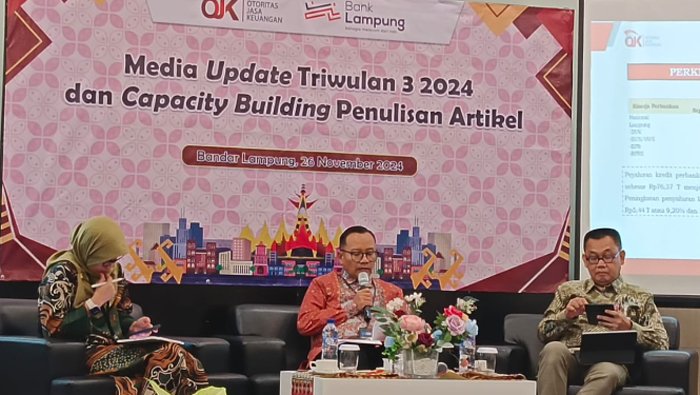 BANDAR LAMPUNG, BERITAANDA – Otoritas Jasa Keuangan (OJK) Provinsi Lampung, menggelar media update perkembangan Industri Jasa Keuangan Triwulan 2 2024 bersama insan media di Hotel Grand Mercure, Bandarlampung, Selasa (26/11/2024).