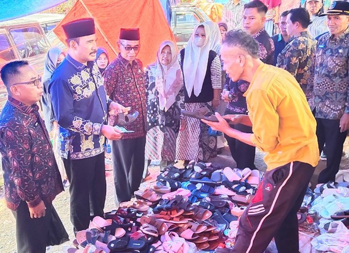 “Yo nian pak, nak beli sandal ini,” ujar pedagang sandal dan sepatu.