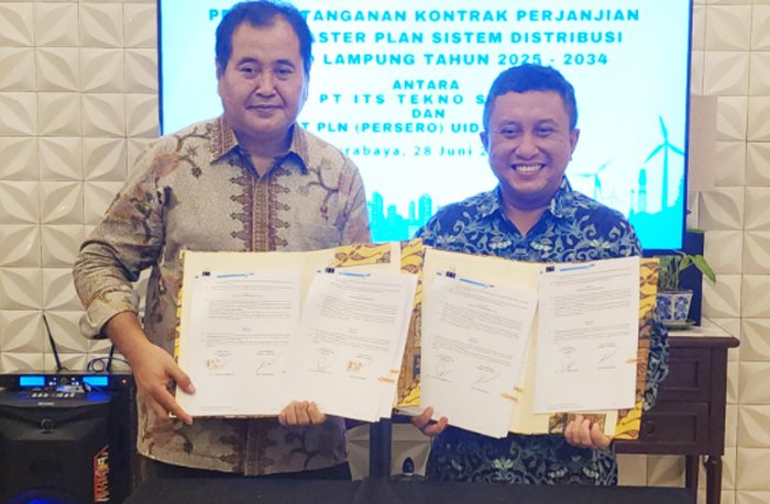 BANDAR LAMPUNG, BERITAANDA – PT PLN (Persero) Unit Induk Distribusi (UID) Lampung menjalin kerja sama dengan PT ITS Tekno Sains untuk menyusun Master Plan Sistem Distribusi Listrik 2025–2034. Penandatanganan kerja sama dilakukan pada Sabtu (28/6/2025) lalu, oleh General Manager PLN UID Lampung Rizky Mochamad dan Direktur PT ITS Tekno Sains Dr. Ir. I Ketut Gunarta MT.
