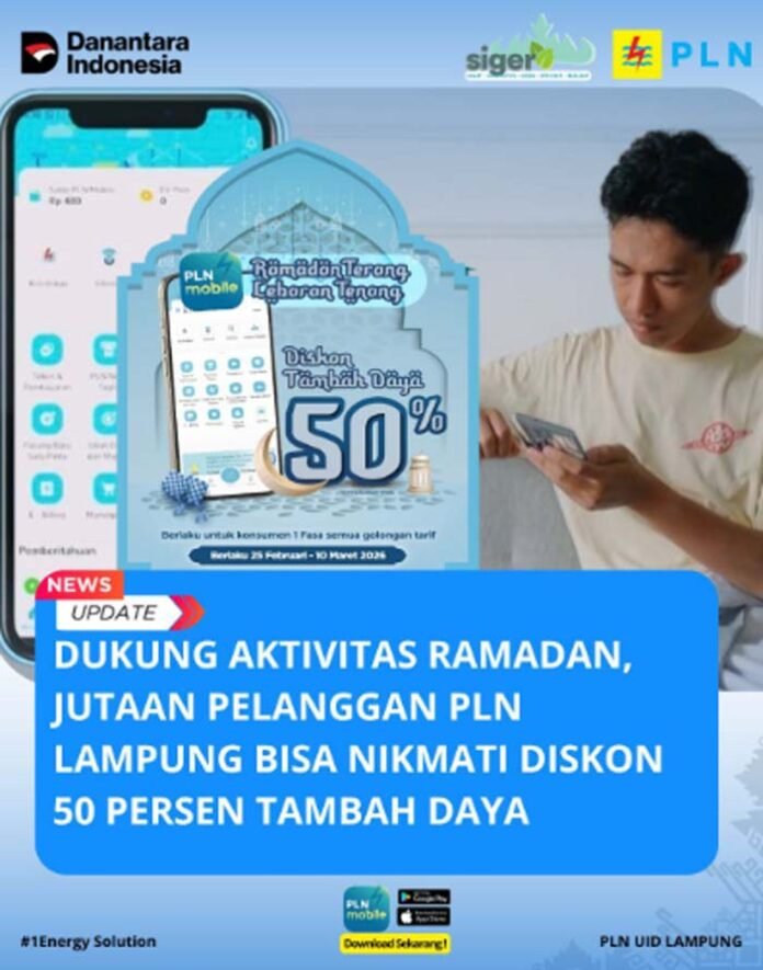 BANDAR LAMPUNG, BERITAANDA – Momentum Ramadan identik dengan meningkatnya aktivitas masyarakat, baik di rumah tangga maupun sektor usaha. Untuk mendukung kenyamanan pelanggan selama bulan suci, PT PLN (Persero) menghadirkan promo diskon 50 persen untuk layanan tambah daya listrik melalui program ‘Ramadan Terang, Lebaran Tenang’.